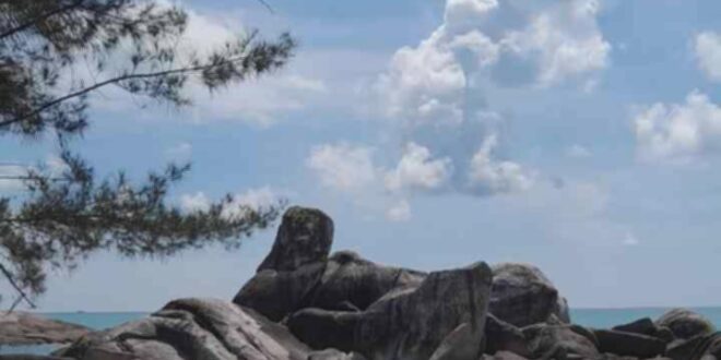 Setibanya di lokasi, pesona Pantai Batu Tunggal langsung terpampang nyata. Hamparan pasir putihnya yang lembut berpadu harmonis dengan formasi batu-batu granit artistik di tepiannya, menciptakan lanskap yang begitu memukau. Keunikan nama “Batu Tunggal” sendiri terasa begitu pas saat melihat sebuah batu granit raksasa yang berdiri tegak sendirian, tampak menonjol di antara gugusan batu granit lainnya, menjadi daya tarik visual yang khas.